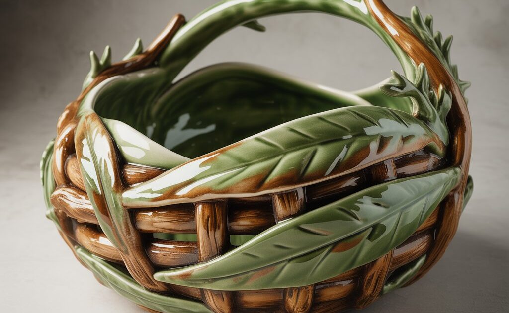 Оригінальна керамічна фруктівниця у вигляді плетеного кошика з декоративними листками створює відчуття природності та затишку; ідеально підходить для подачі фруктів або як стильний елемент декору, виготовлена з якісної кераміки, має глянцеве покриття та виразний дизайн.